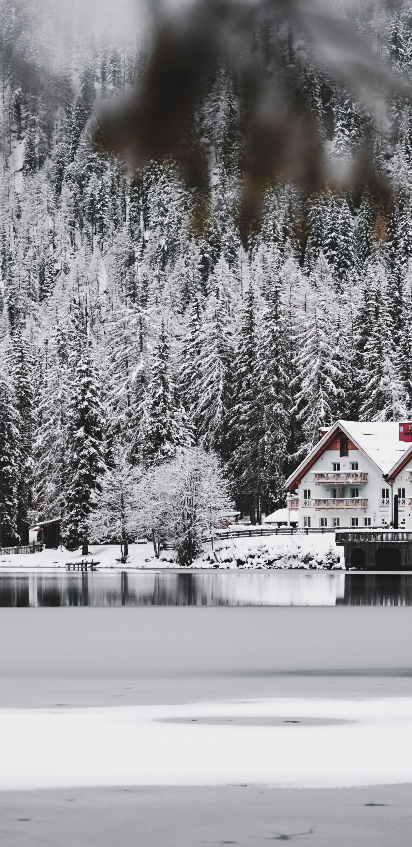 Обои: зима, снег, холод, лед, дом у озера, лес, в лесу - 1440x2960