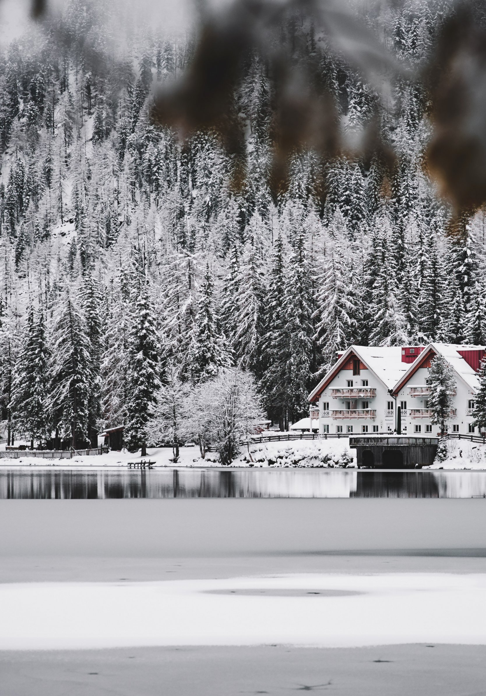 Обои: зима, снег, холод, лед, дом у озера, лес, в лесу - 1668x2388