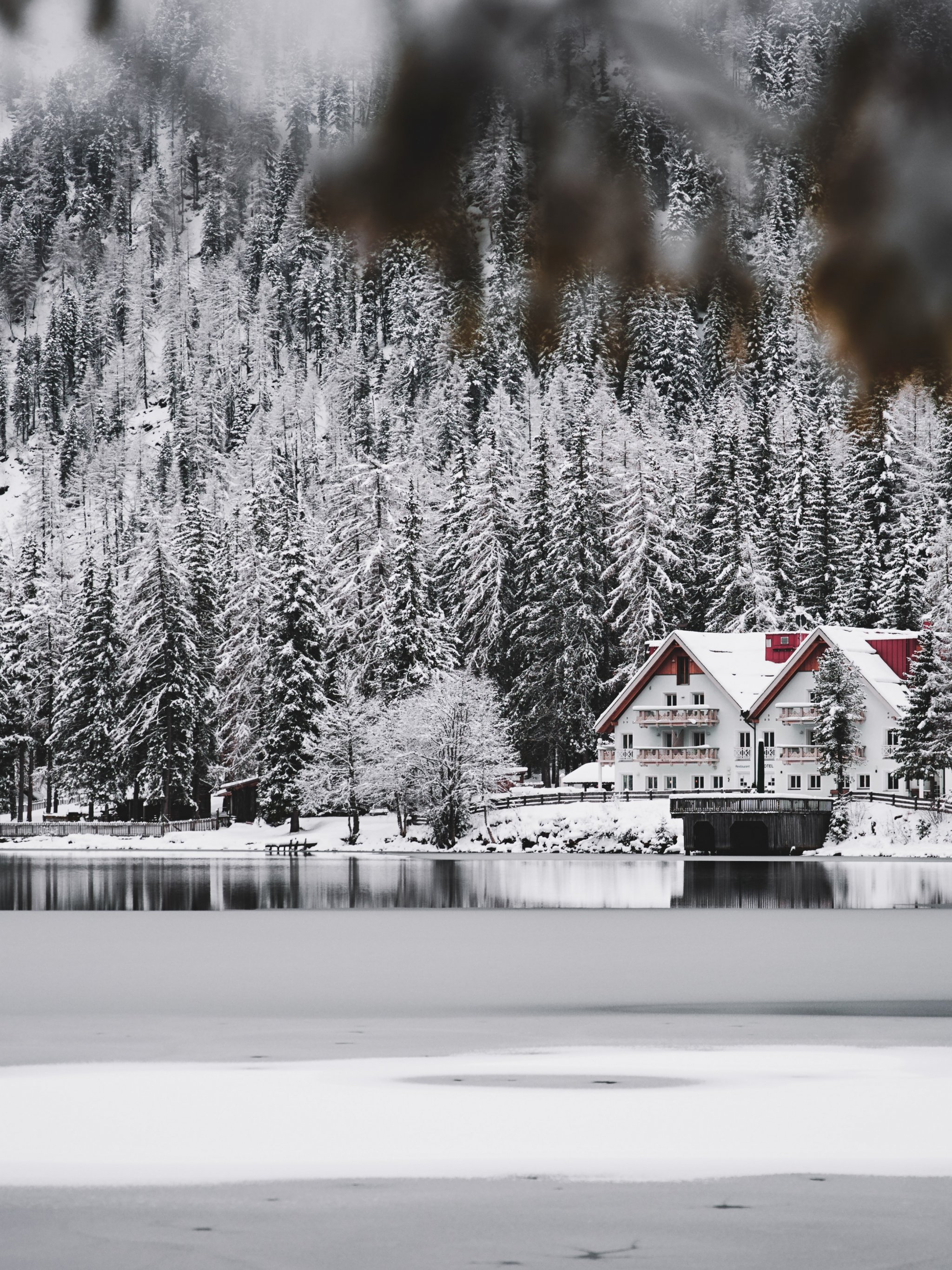 Обои: зима, снег, холод, лед, дом у озера, лес, в лесу - 2048x2732