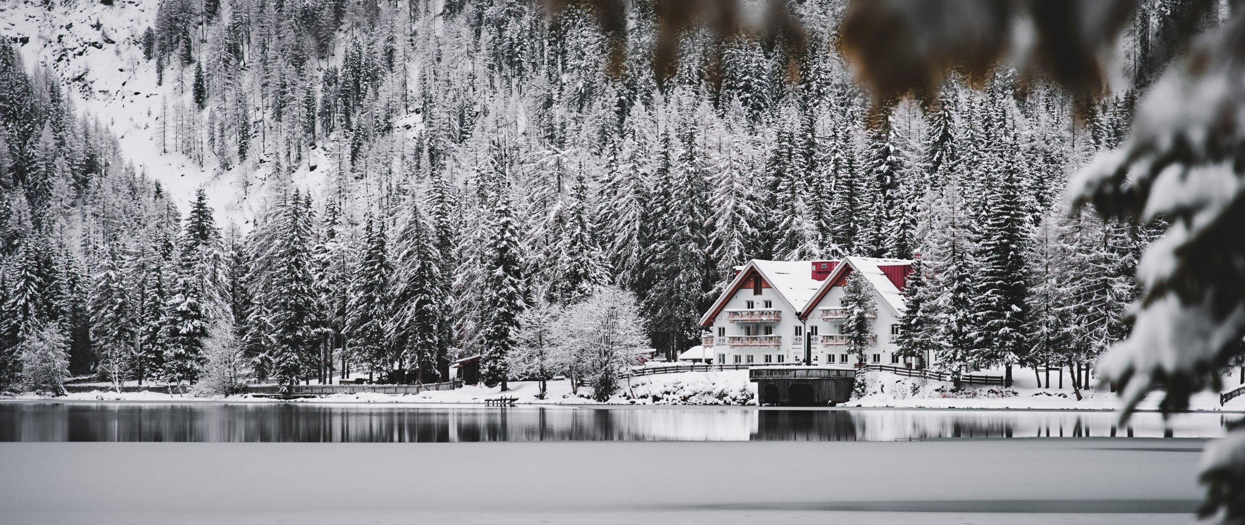 Обои: зима, снег, холод, лед, дом у озера, лес, в лесу - 2560x1080