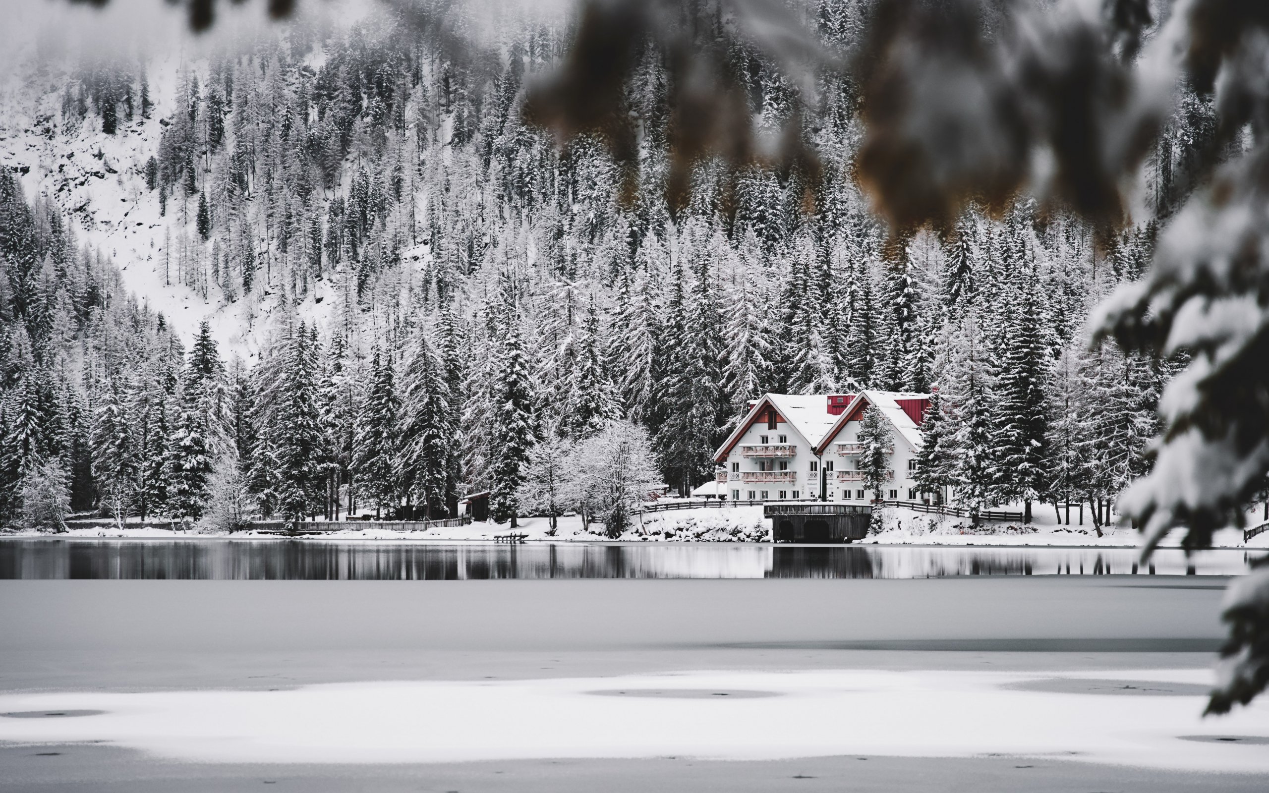 Обои: зима, снег, холод, лед, дом у озера, лес, в лесу - 2560x1600