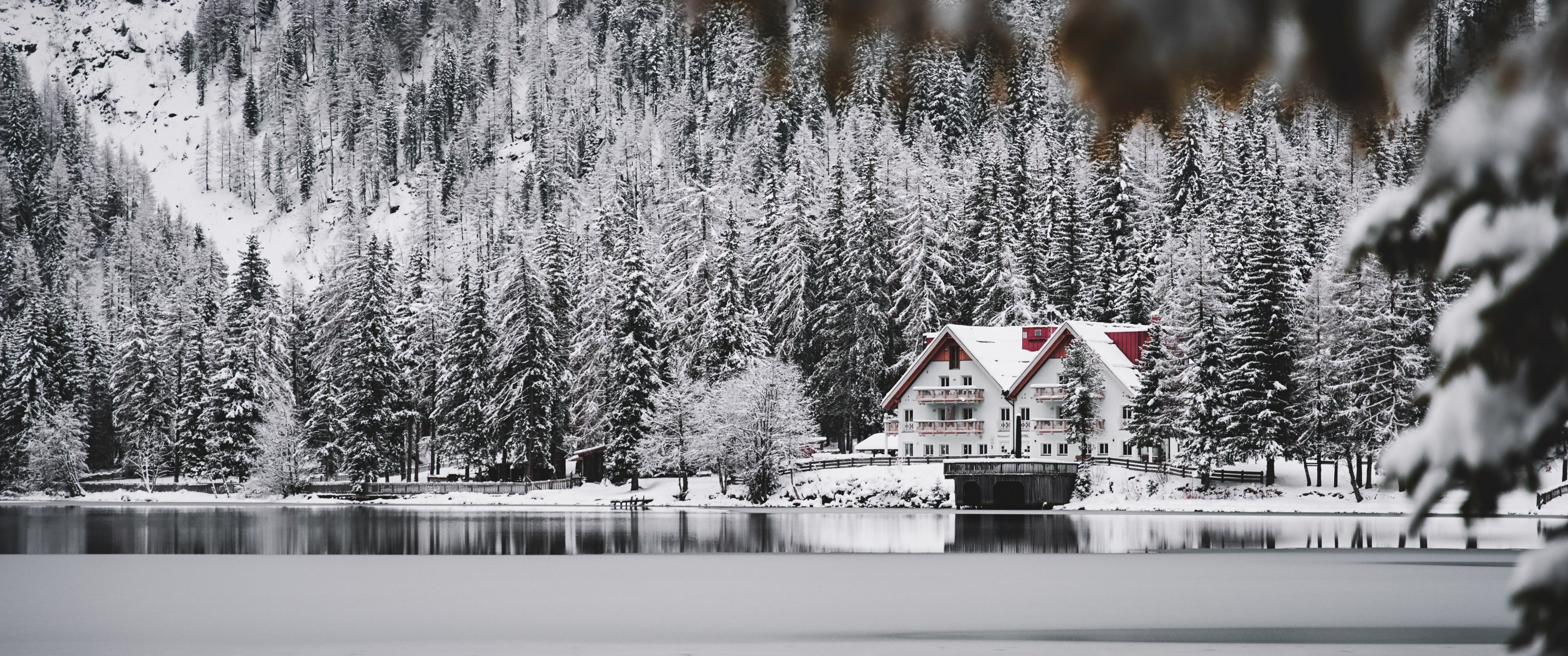 Обои: зима, снег, холод, лед, дом у озера, лес, в лесу - 3440x1440