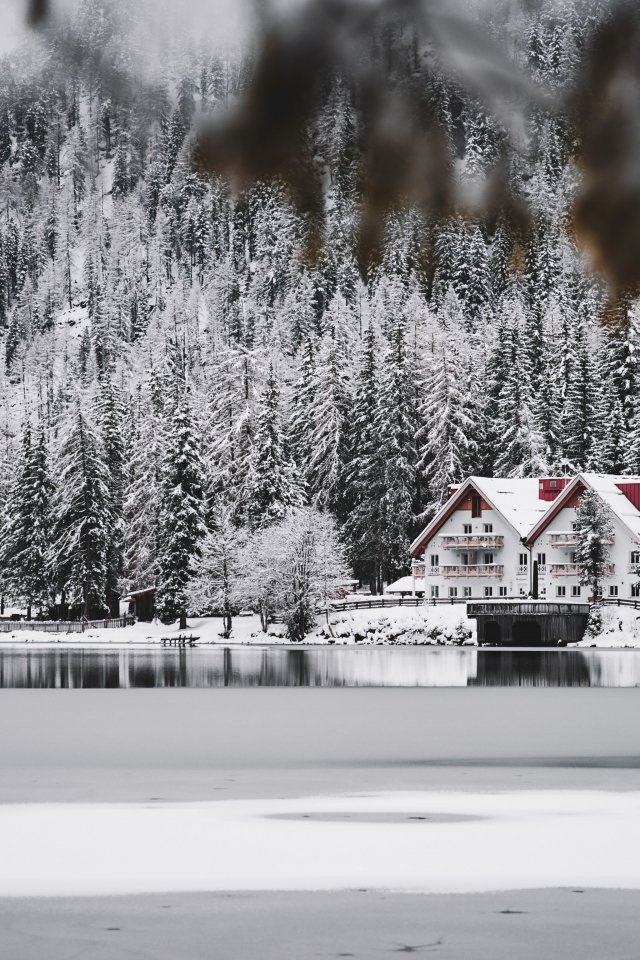 Обои: зима, снег, холод, лед, дом у озера, лес, в лесу - 640x960