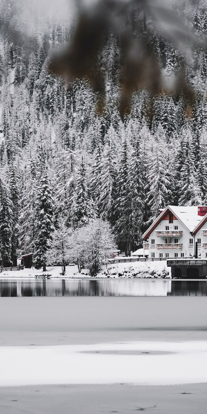 Обои: зима, снег, холод, лед, дом у озера, лес, в лесу - 720x1440