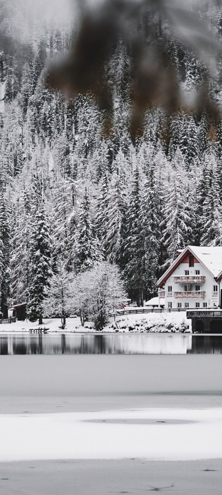 Обои: зима, снег, холод, лед, дом у озера, лес, в лесу - 720x1600