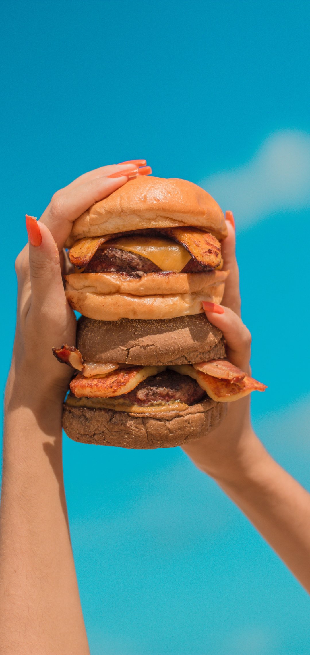 Обои: бургер, девушка, руки, небо, сыр, котлета, булочка, еда - 1080x2280