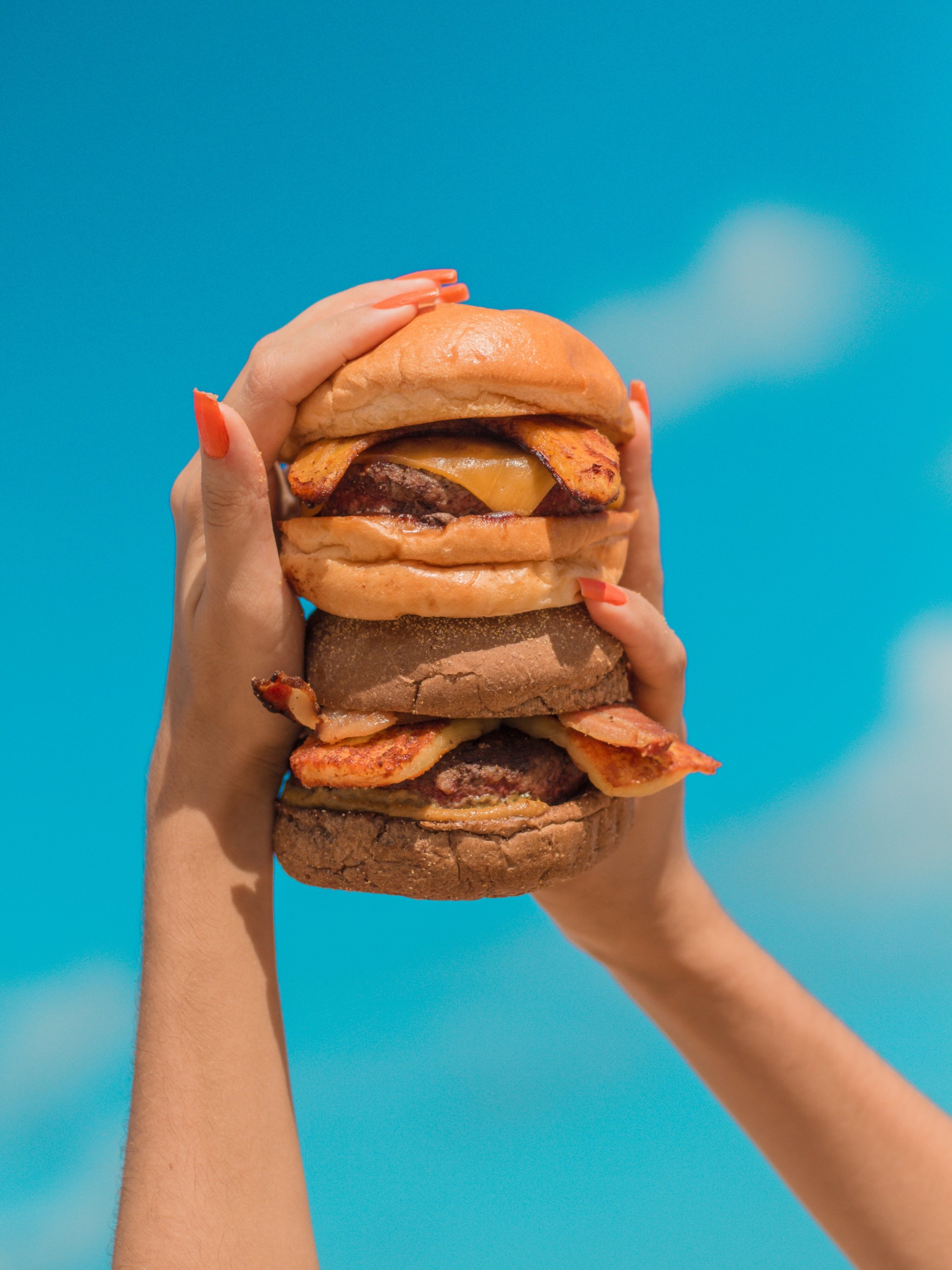 Обои: бургер, девушка, руки, небо, сыр, котлета, булочка, еда - 2048x2732