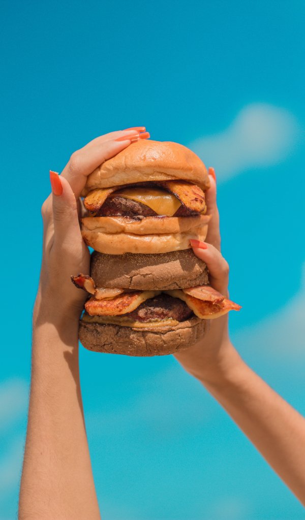 Обои: бургер, девушка, руки, небо, сыр, котлета, булочка, еда - 600x1024