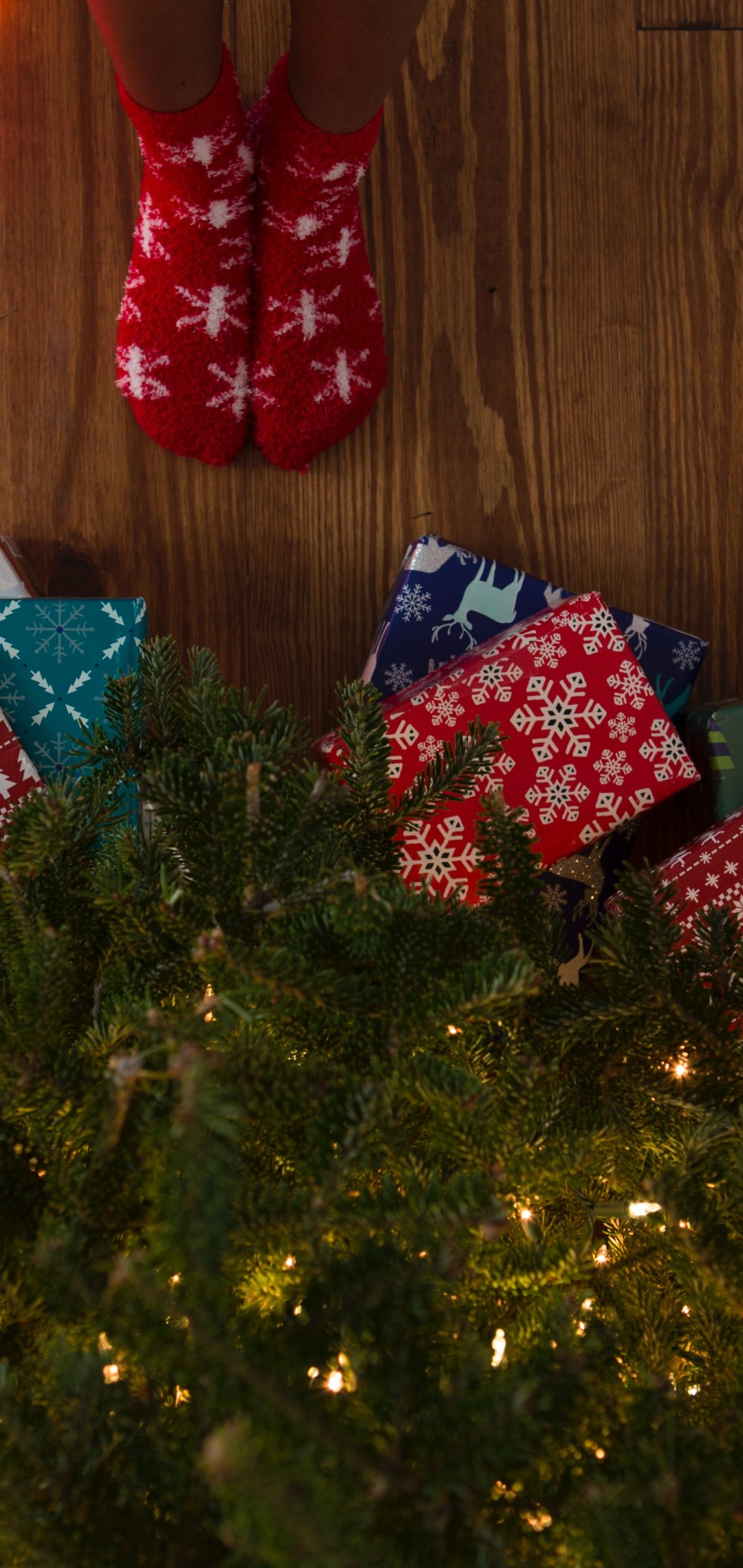 Обои: подарки, елка, праздники, ноги, носки, яркие лампочки - 1080x2280