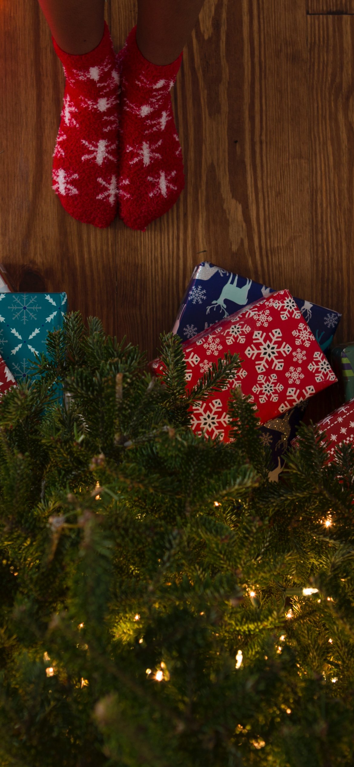 Обои: подарки, елка, праздники, ноги, носки, яркие лампочки - 1170x2532