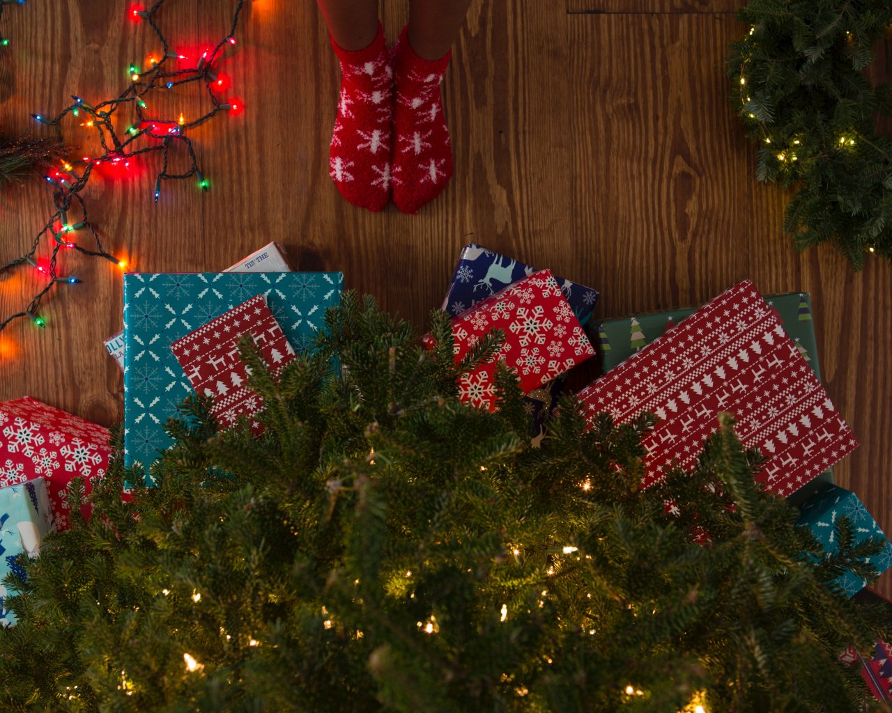 Обои: подарки, елка, праздники, ноги, носки, яркие лампочки - 1280x1024