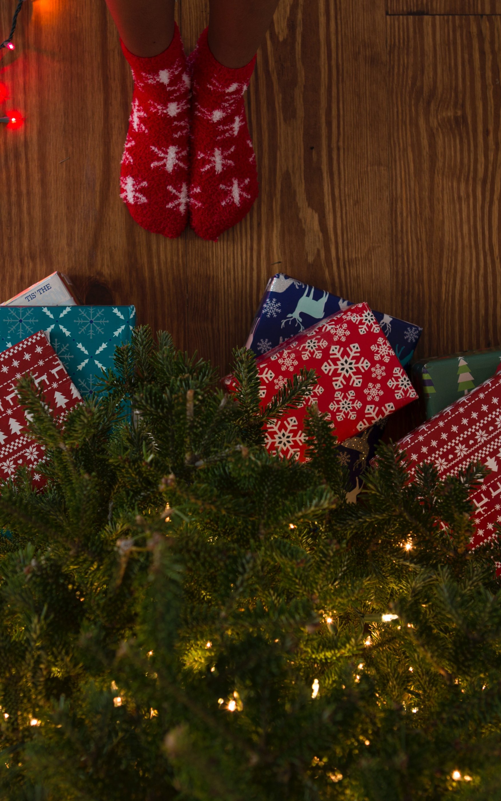 Обои: подарки, елка, праздники, ноги, носки, яркие лампочки - 1752x2800