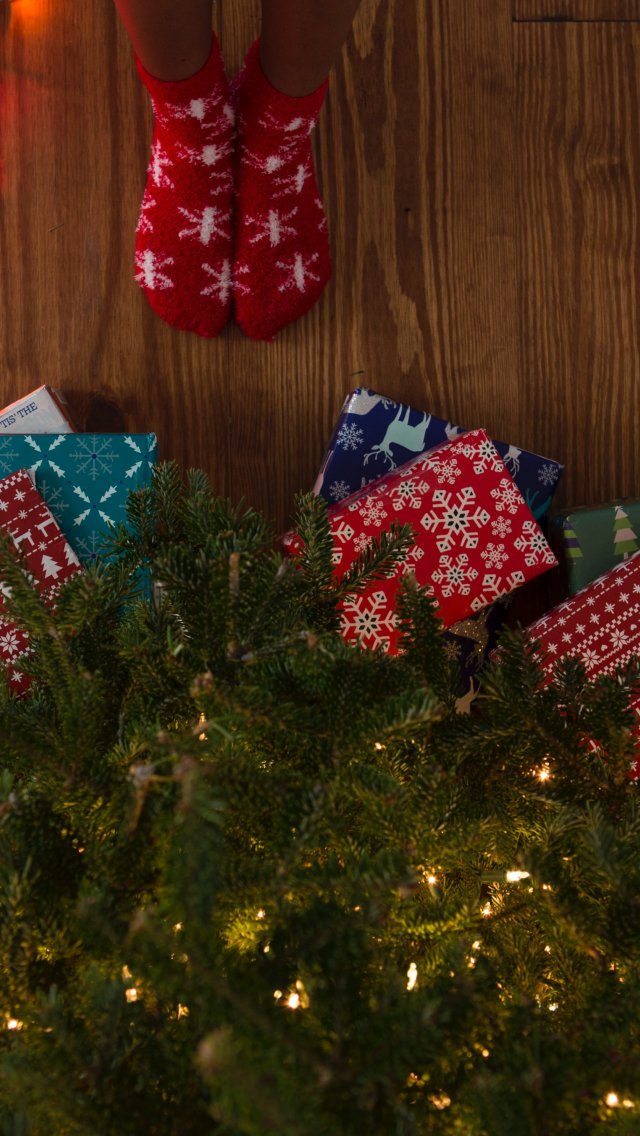 Обои: подарки, елка, праздники, ноги, носки, яркие лампочки - 640x1136