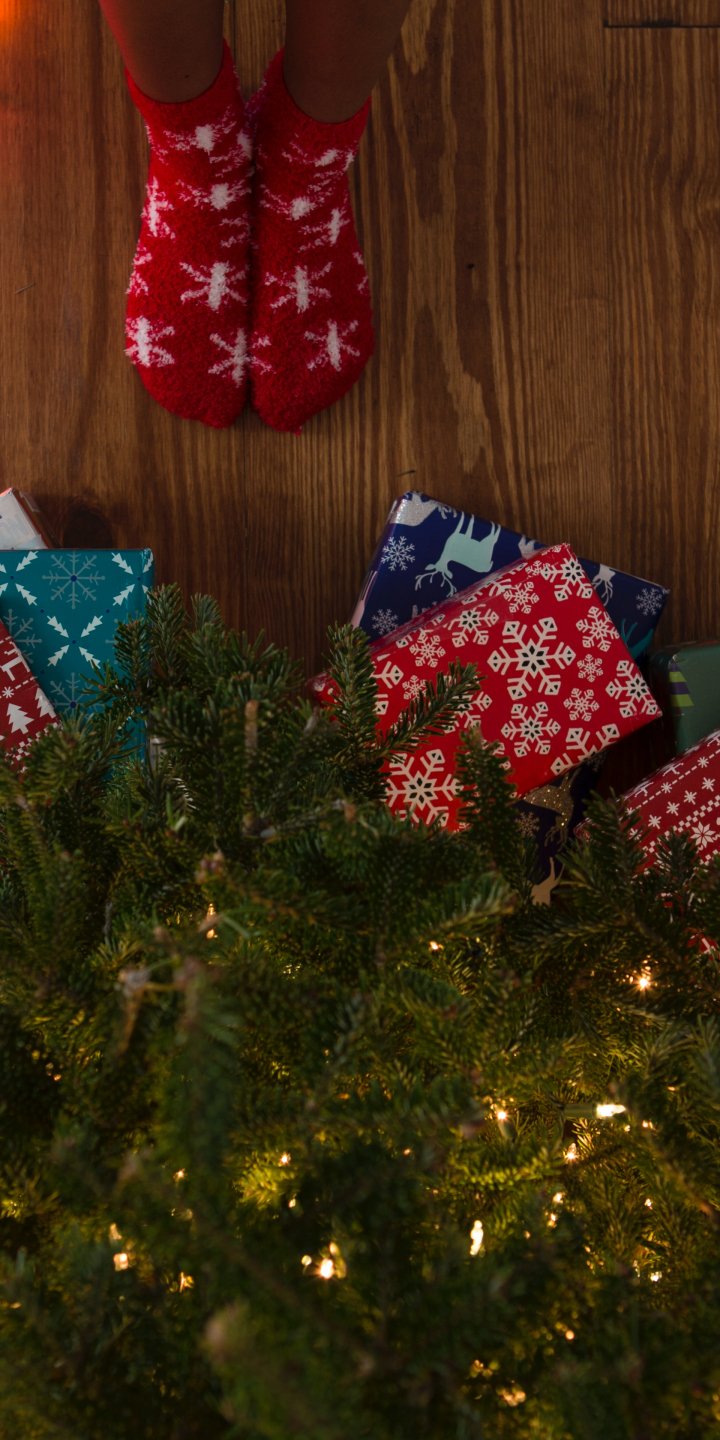 Обои: подарки, елка, праздники, ноги, носки, яркие лампочки - 720x1440