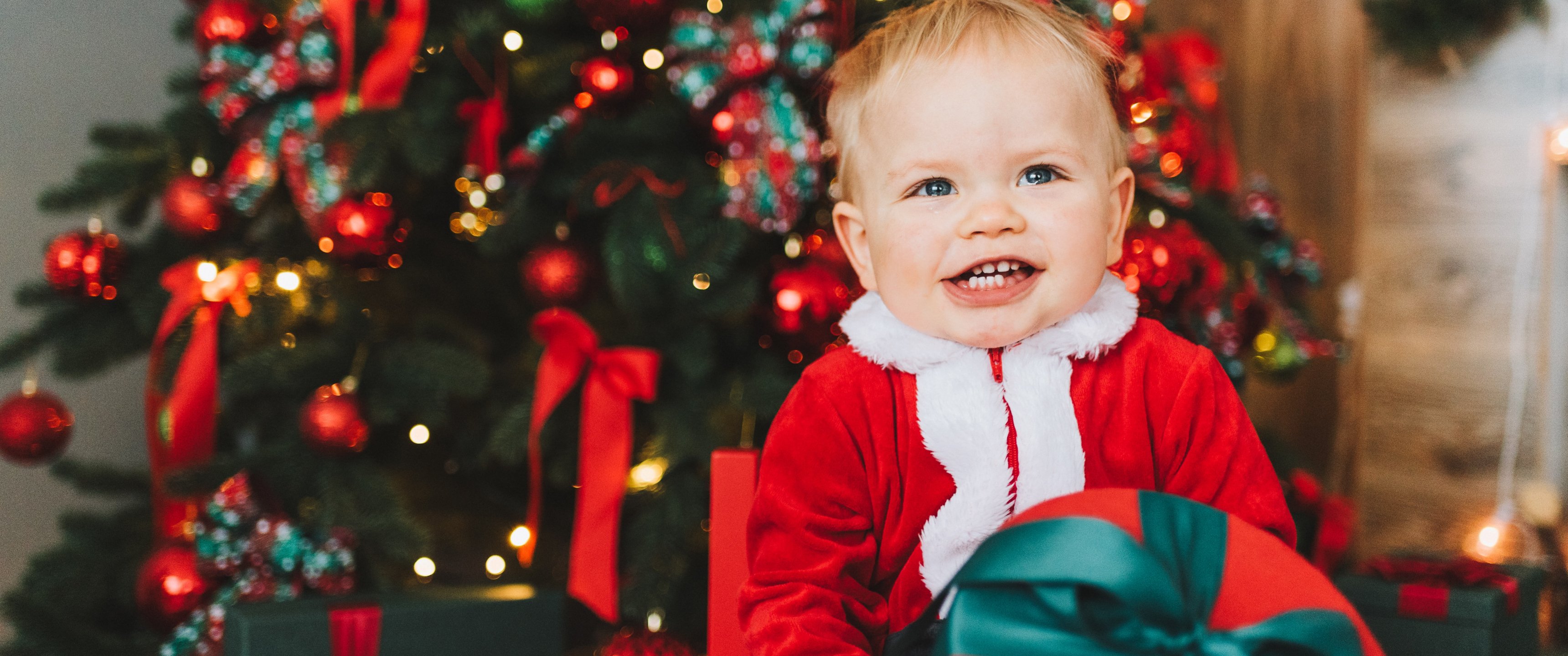 Обои: ребенок, улыбка, маленький Санта, новогодняя фотосессия - 3440x1440