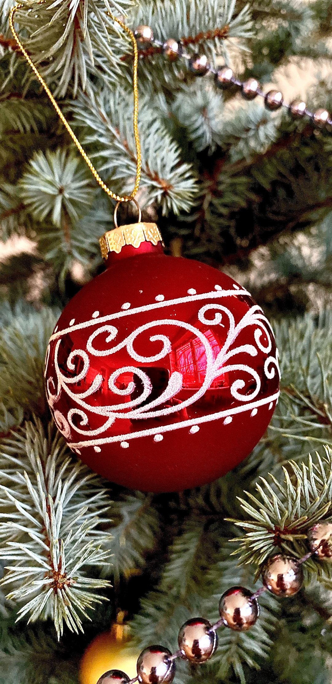 Обои: ель, елочная игрушка, иголки, узор, красный - 1080x2220
