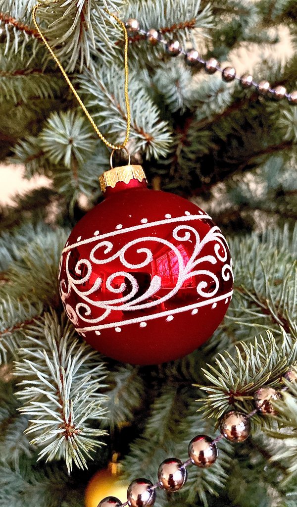 Обои: ель, елочная игрушка, иголки, узор, красный - 600x1024