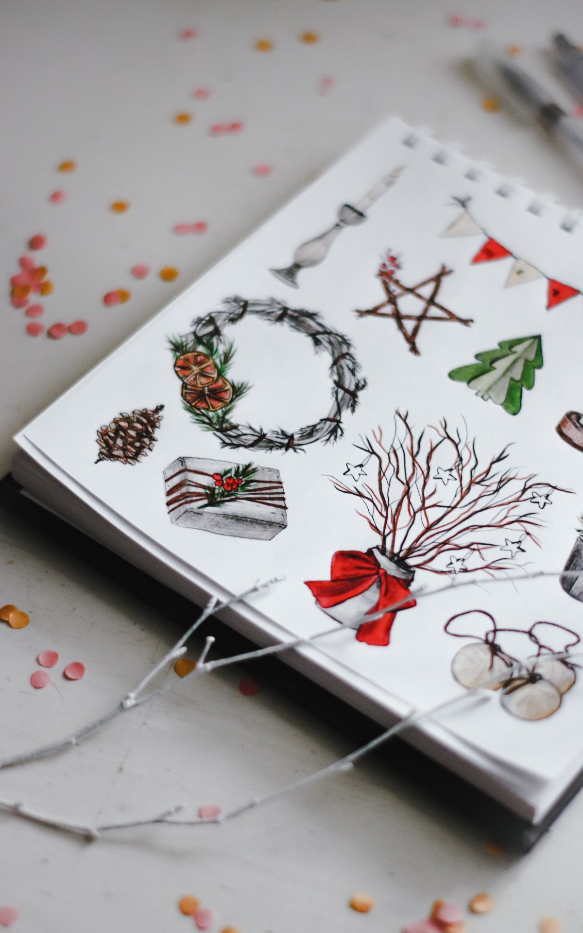 Обои: рисунки, к новому году, декорации, ветка, блокнот, на столе - 1200x1920