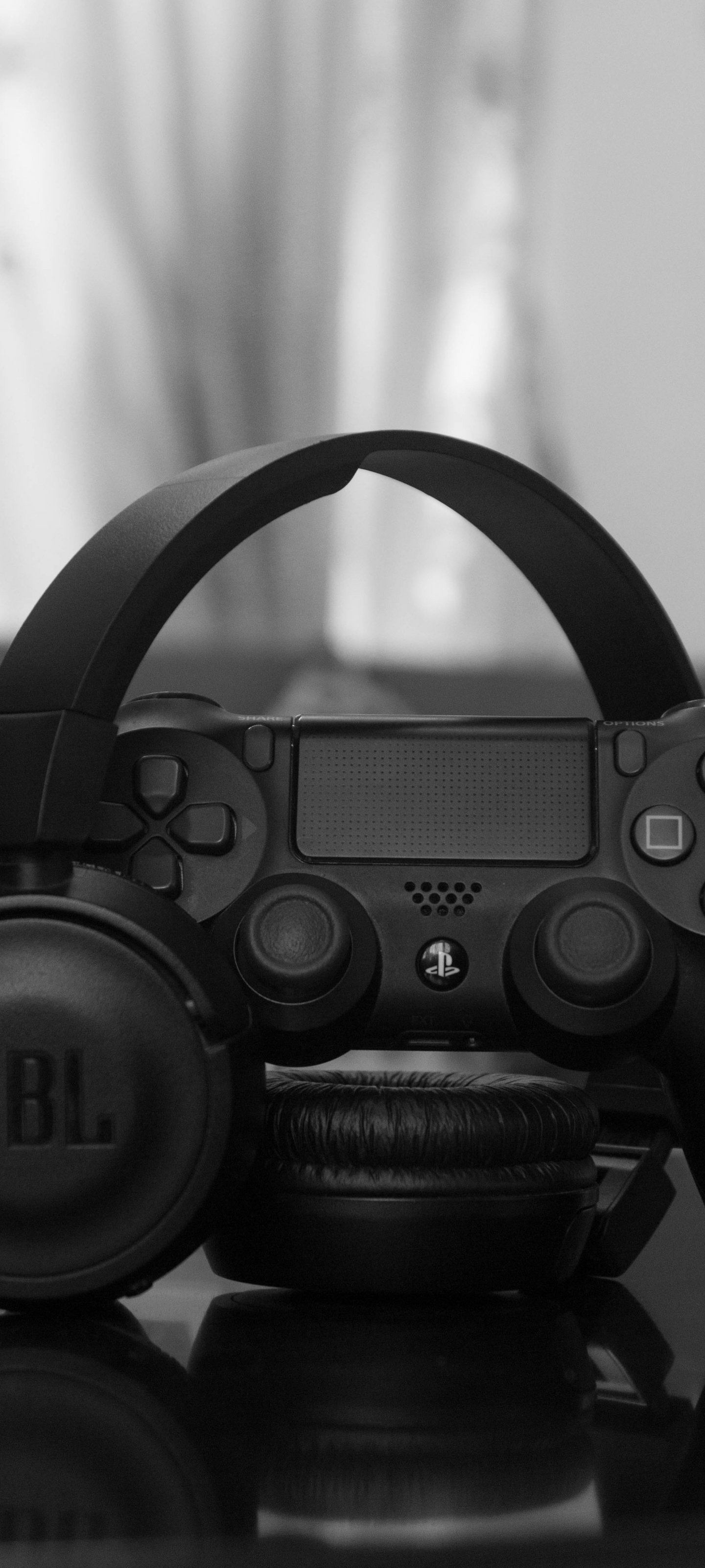 Обои: наушники, джойстик, игра, черно-белое фото, музыка - 1440x3200