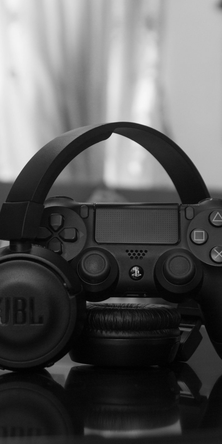 Обои: наушники, джойстик, игра, черно-белое фото, музыка - 720x1440