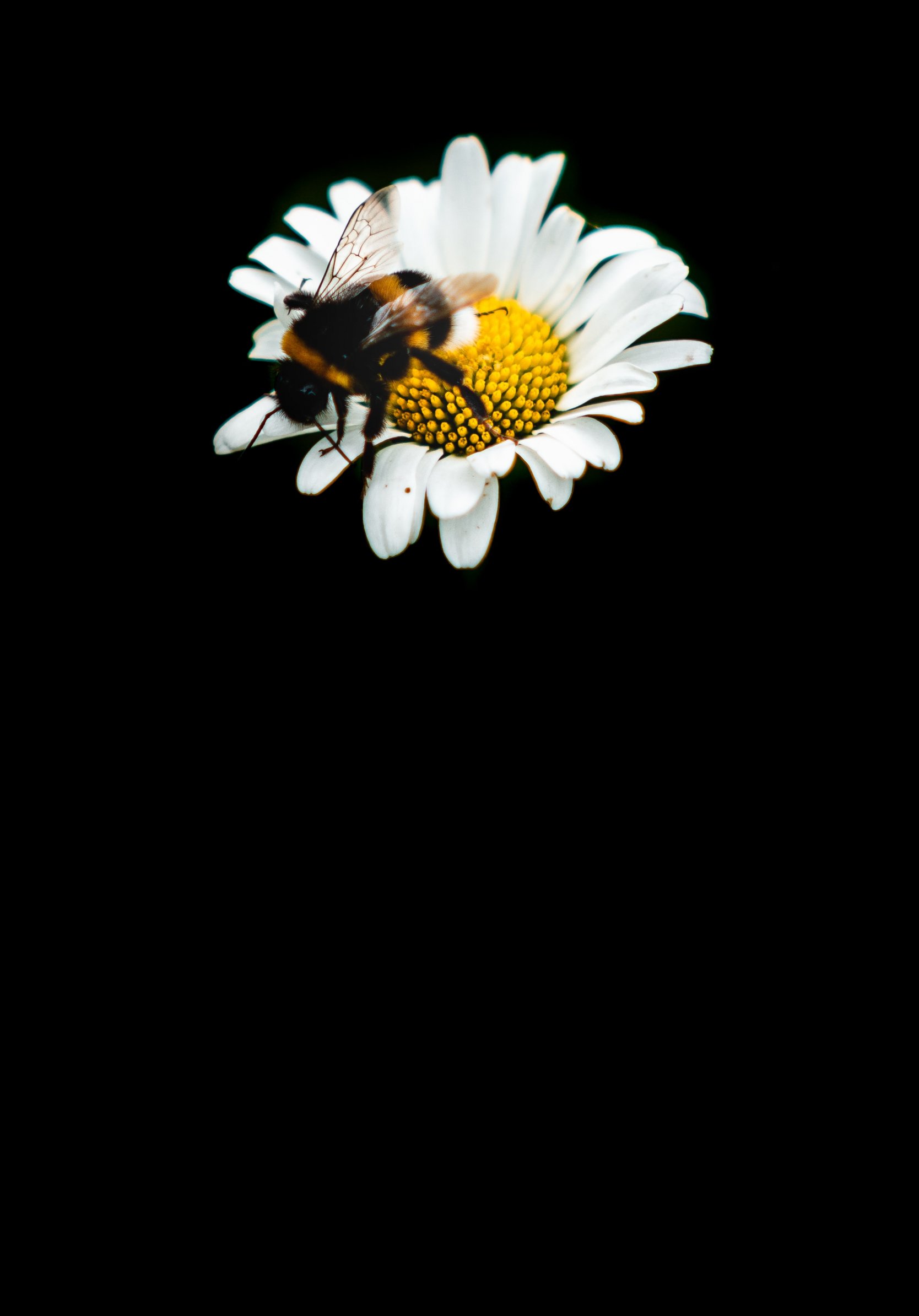 Обои: пчела, ромашка, макро, цветок, черный фон - 1668x2388