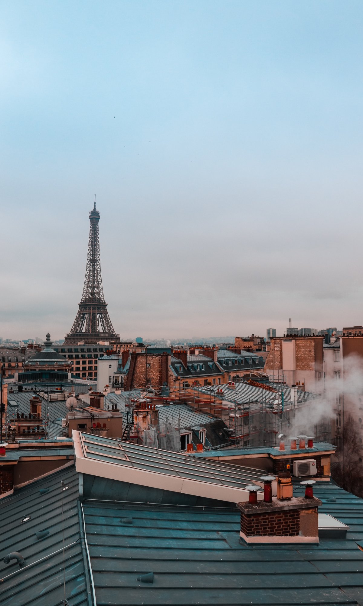 Обои: Франция, Париж, крыши домов, на крыше, дым, Эйфелева башня - 1200x2000