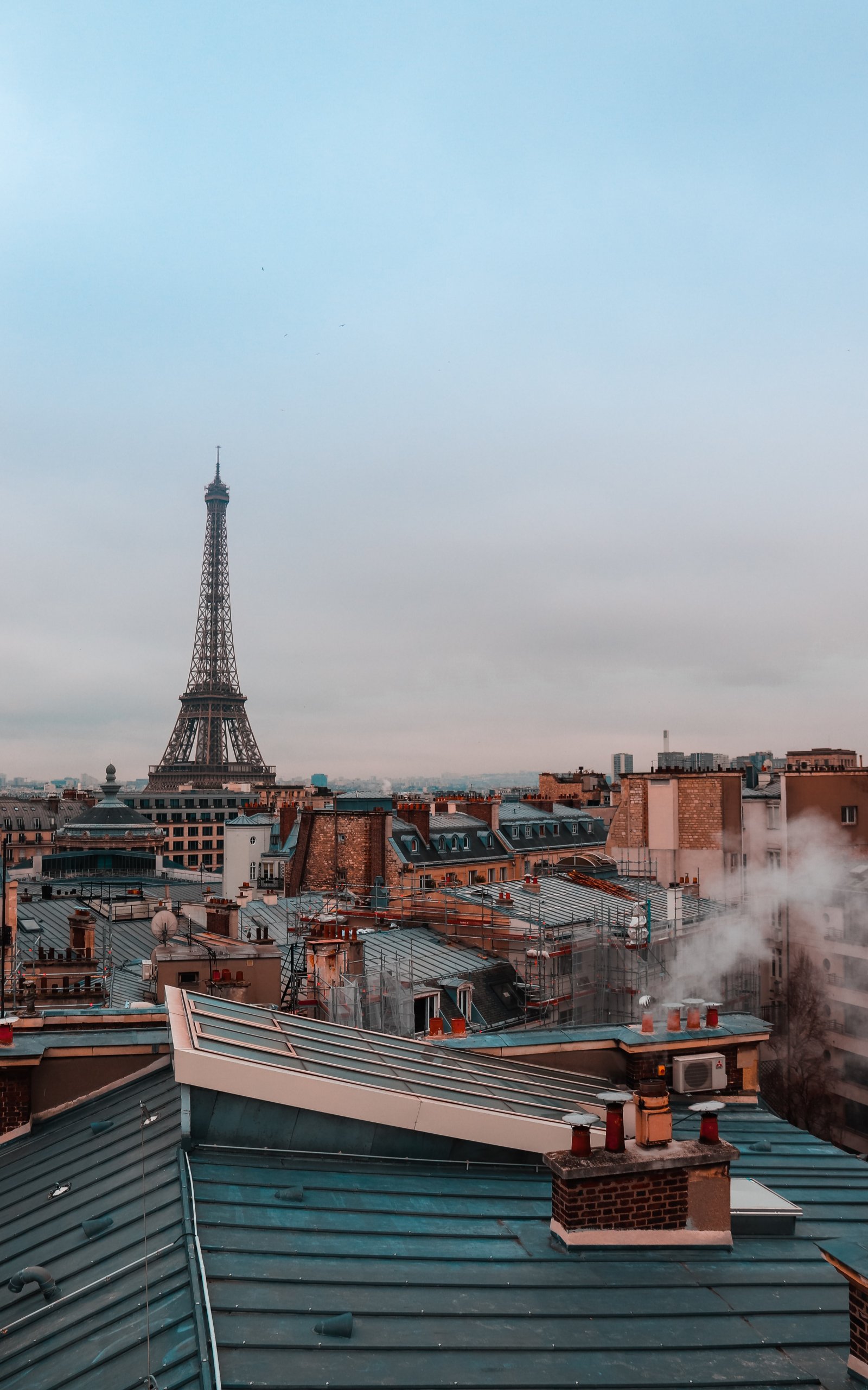 Обои: Франция, Париж, крыши домов, на крыше, дым, Эйфелева башня - 1600x2560
