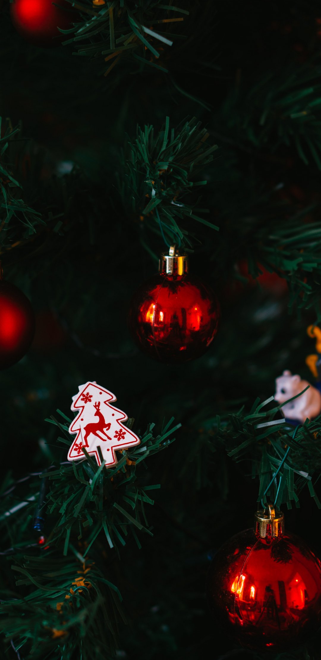 Обои: свечи, праздник, искусственная елка, елочные игрушки, игрушки, олень - 1080x2220
