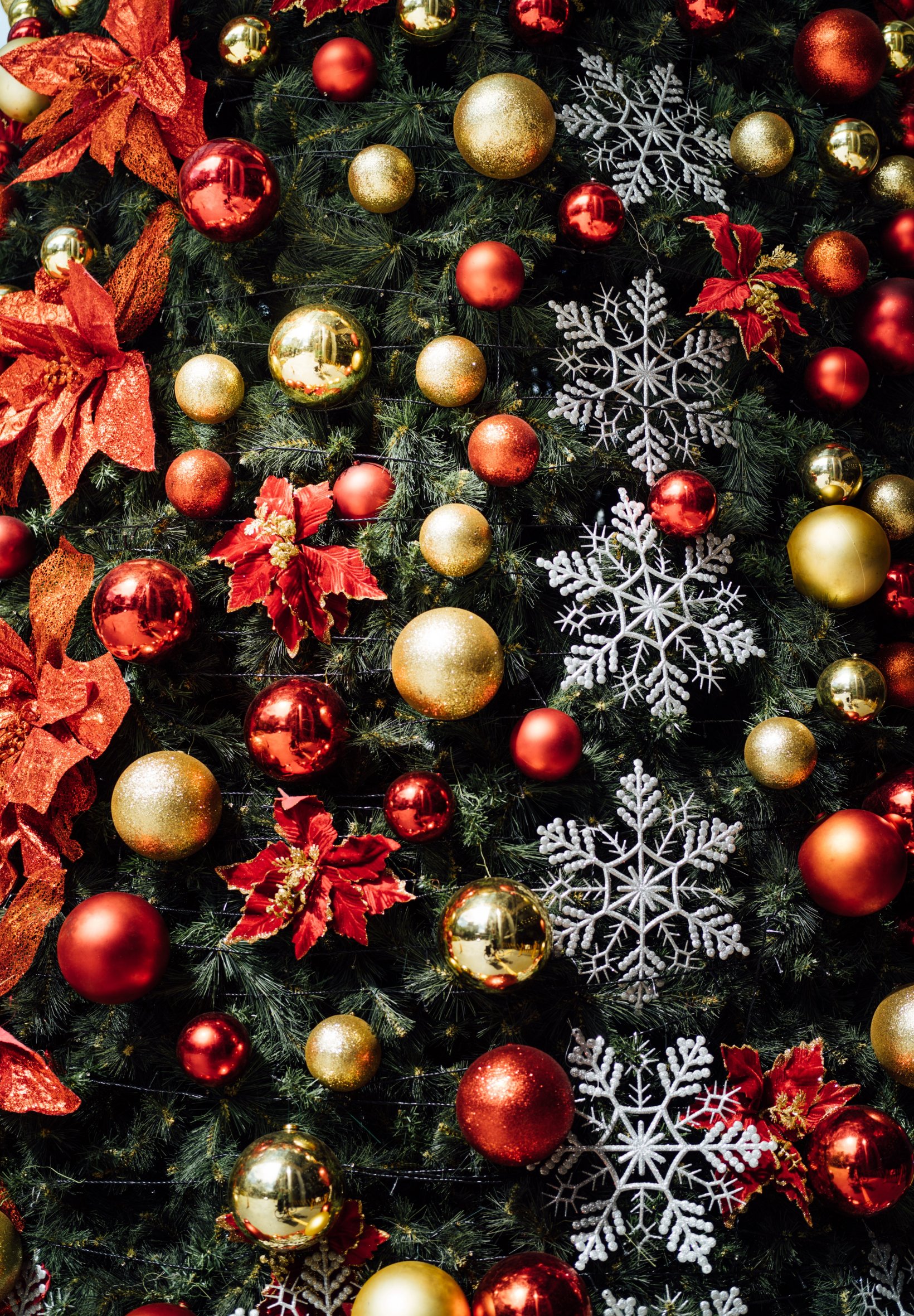 Обои: украшения на елку, снежинки, красный, золотой, шарики, настроение, праздник, счастье - 1640x2360