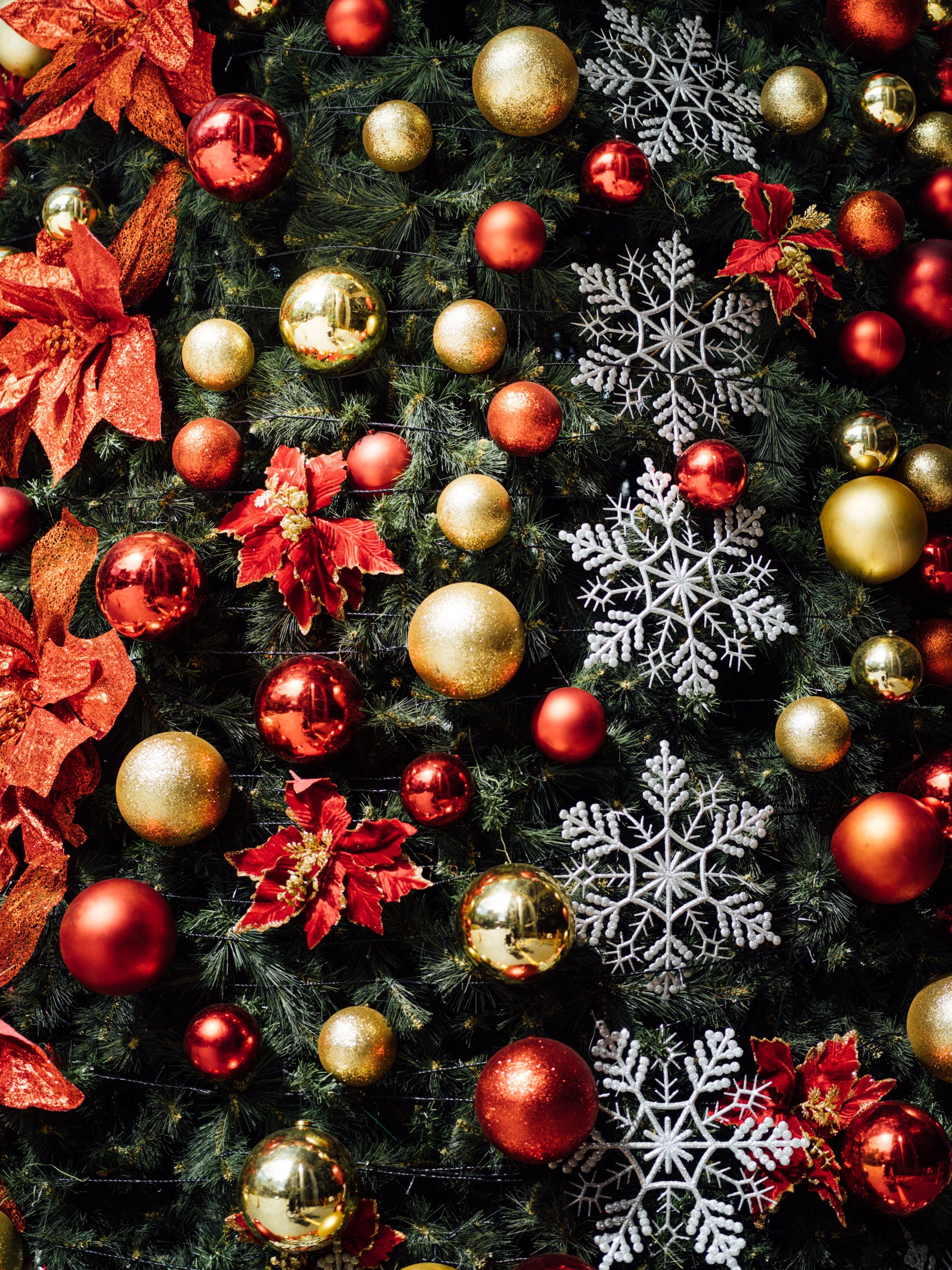 Обои: украшения на елку, снежинки, красный, золотой, шарики, настроение, праздник, счастье - 2048x2732
