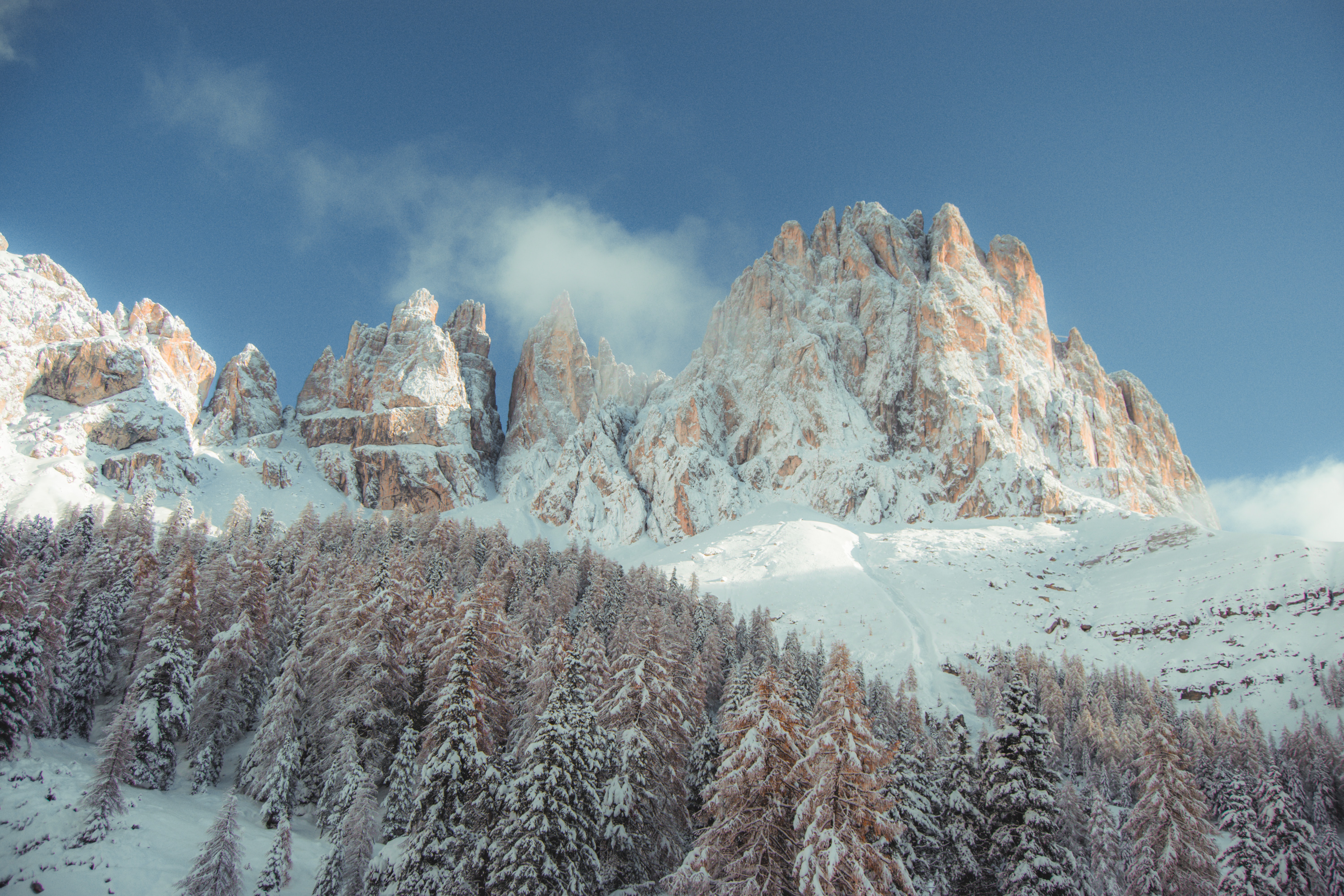 Обои: горы, заснеженные холмы, деревья, снег, тропинка, зима - 6000x4000