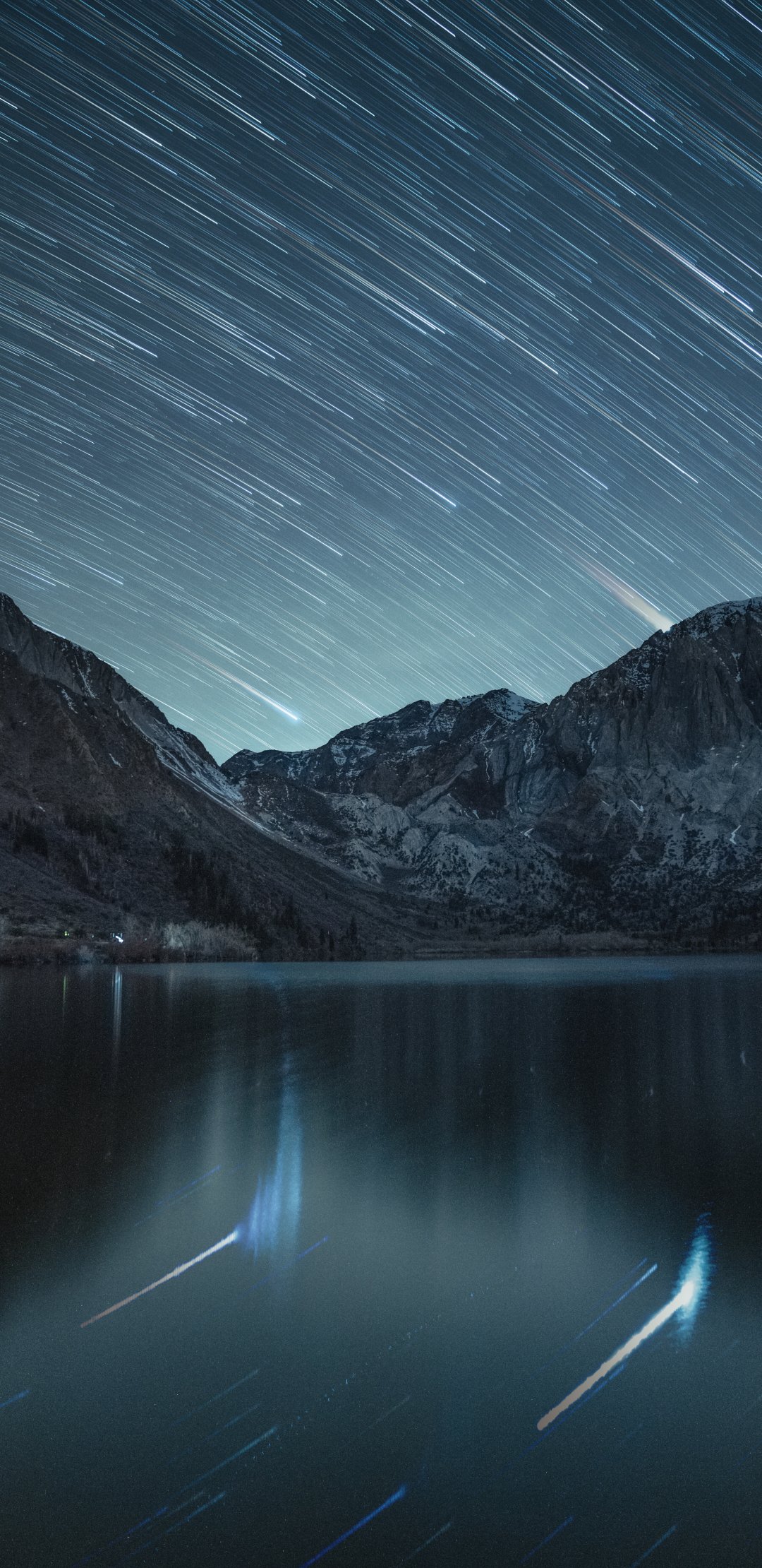 Обои: звезды, звезды падают, длинная выдержка, озеро, горное озеро, горы - 1080x2220