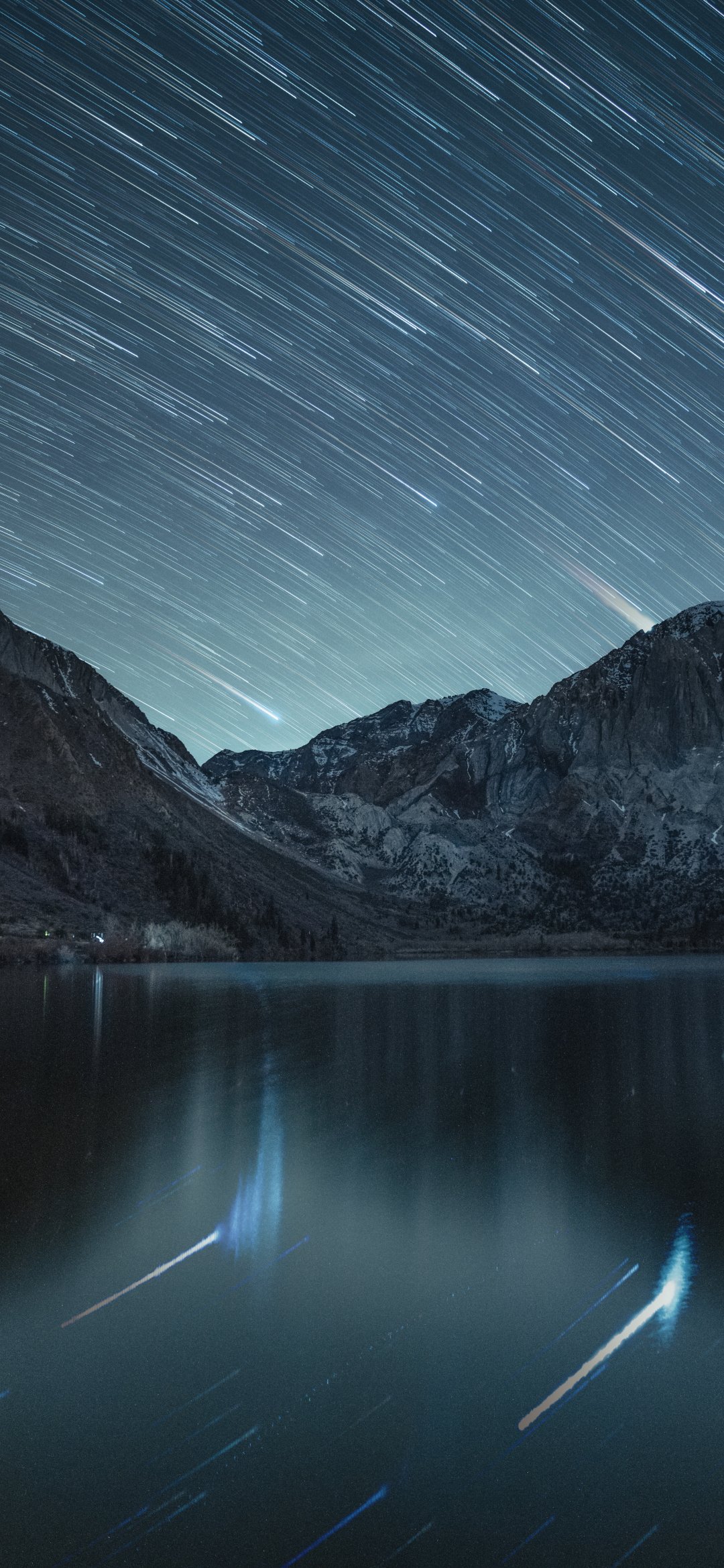 Обои: звезды, звезды падают, длинная выдержка, озеро, горное озеро, горы - 1080x2340