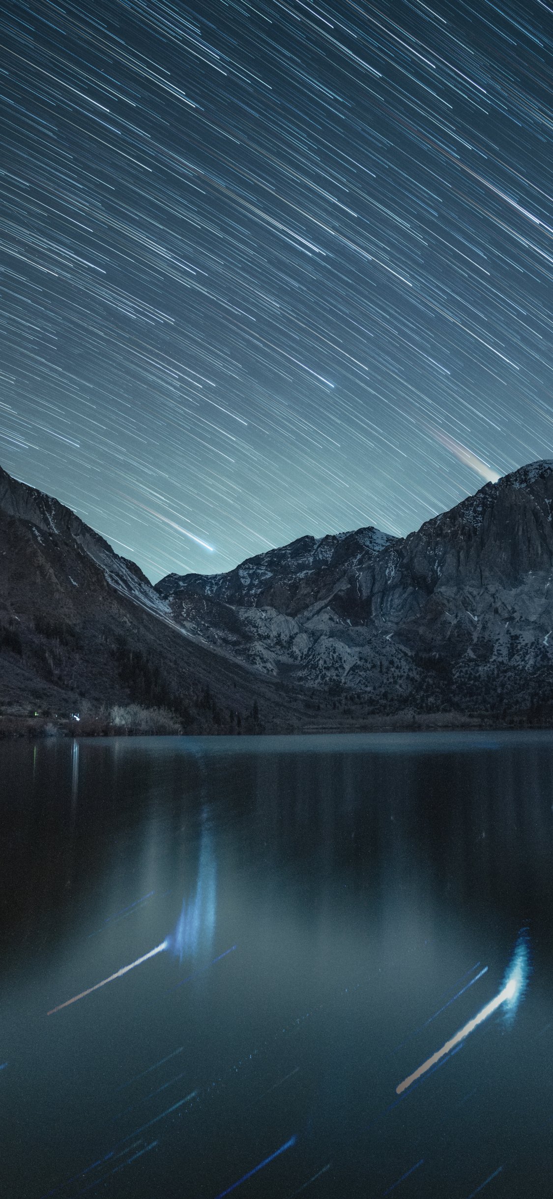 Обои: звезды, звезды падают, длинная выдержка, озеро, горное озеро, горы - 1125x2436