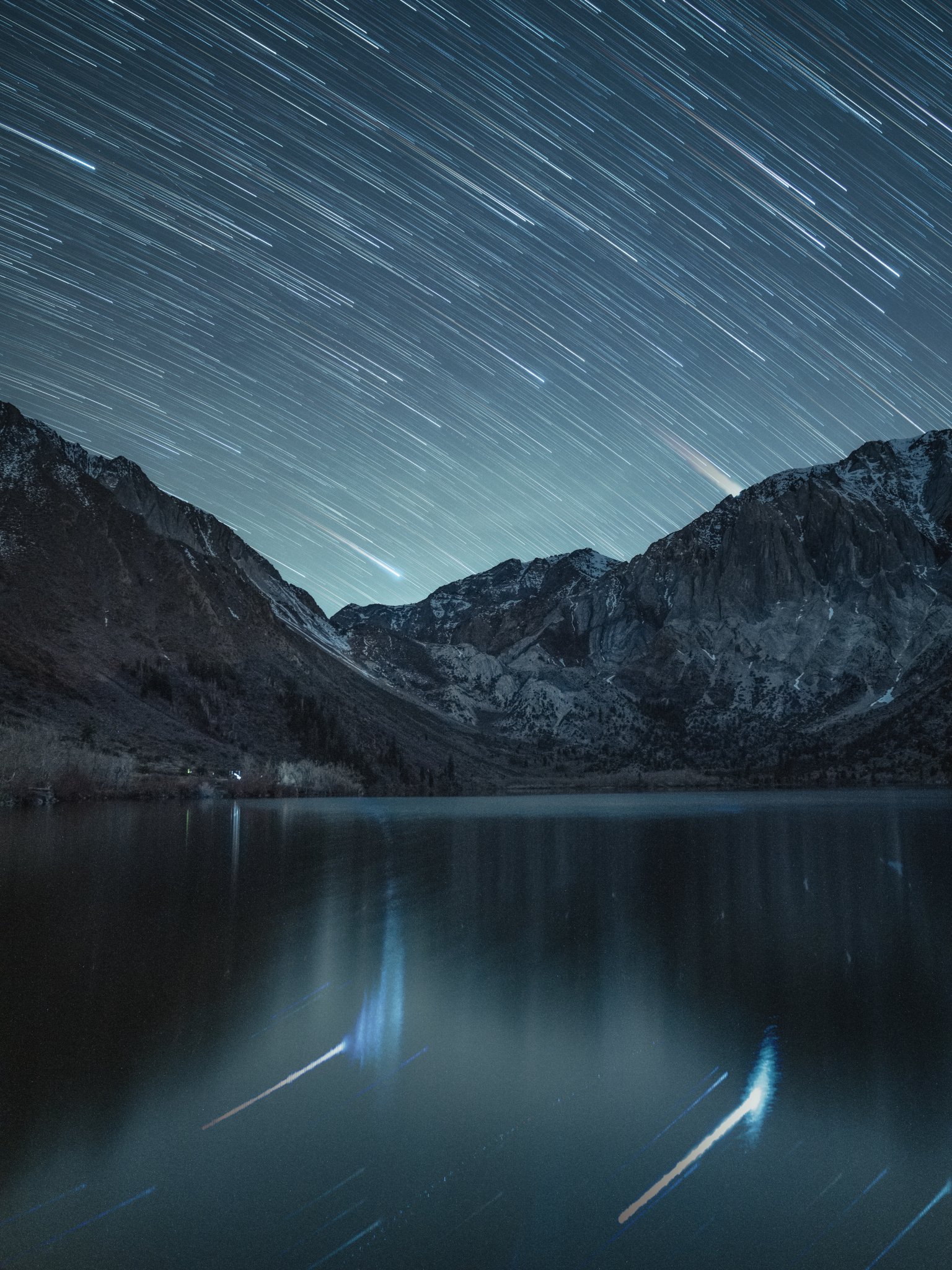 Обои: звезды, звезды падают, длинная выдержка, озеро, горное озеро, горы - 1536x2048