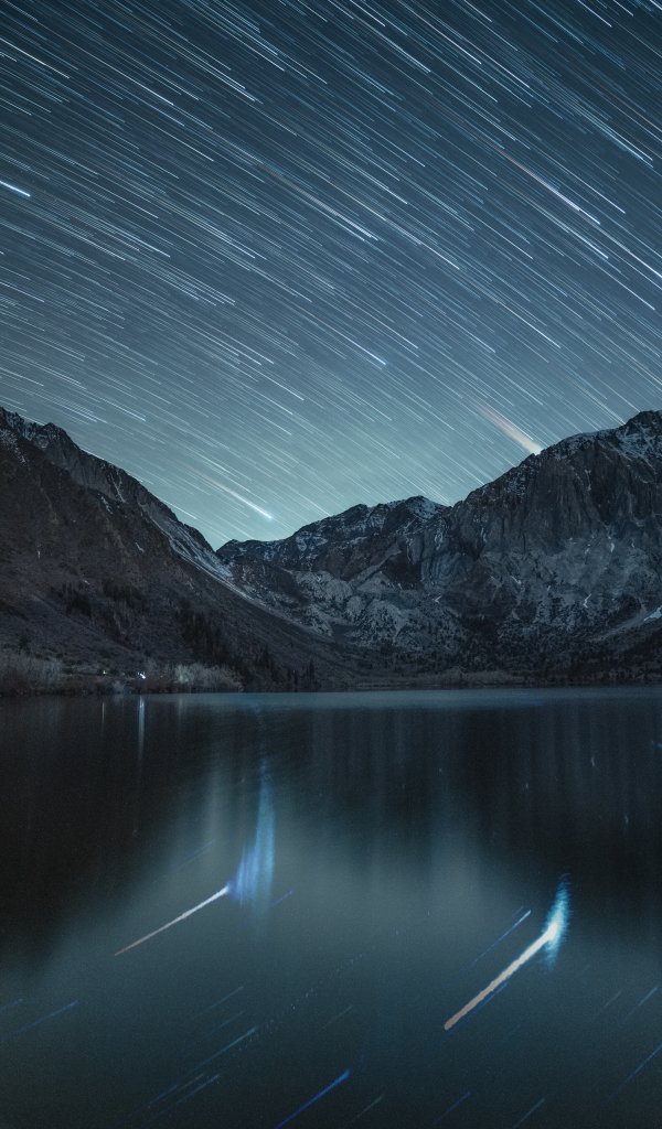 Обои: звезды, звезды падают, длинная выдержка, озеро, горное озеро, горы - 600x1024