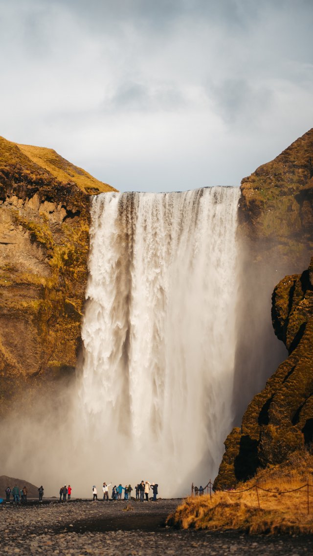 Обои: водопад, туристы, вода, скалы - 640x1136