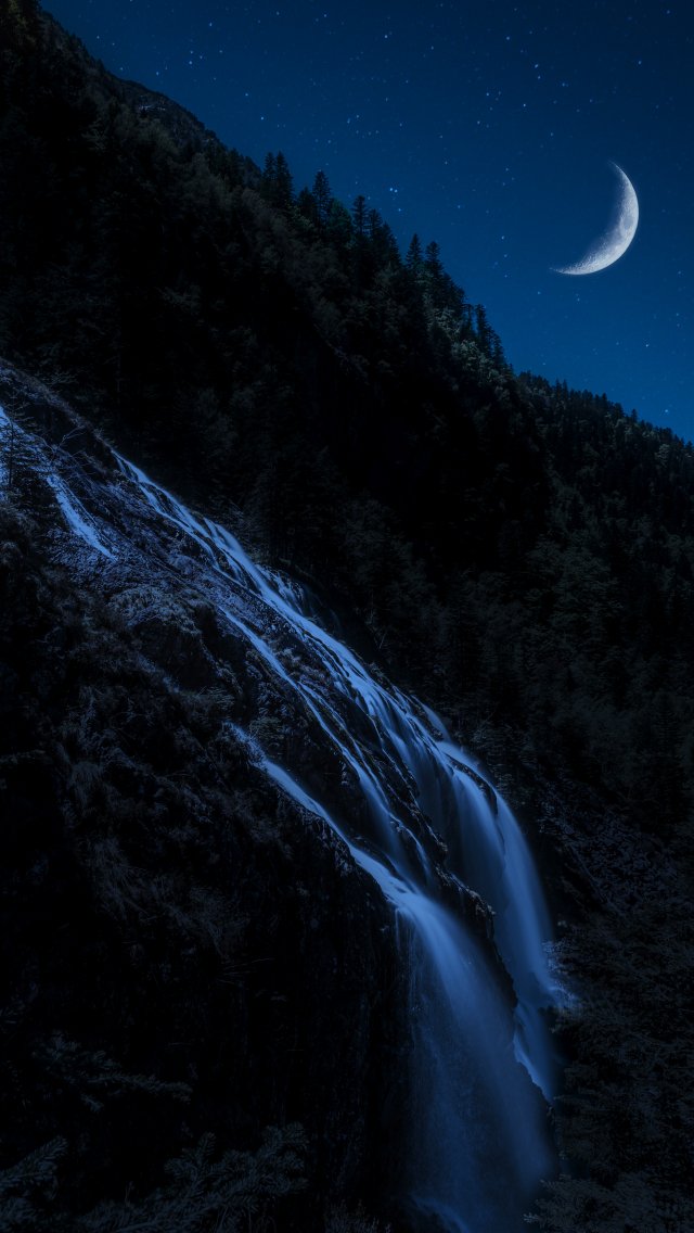 Обои: луна, водопад, ночь, месяц, горы, лес - 640x1136