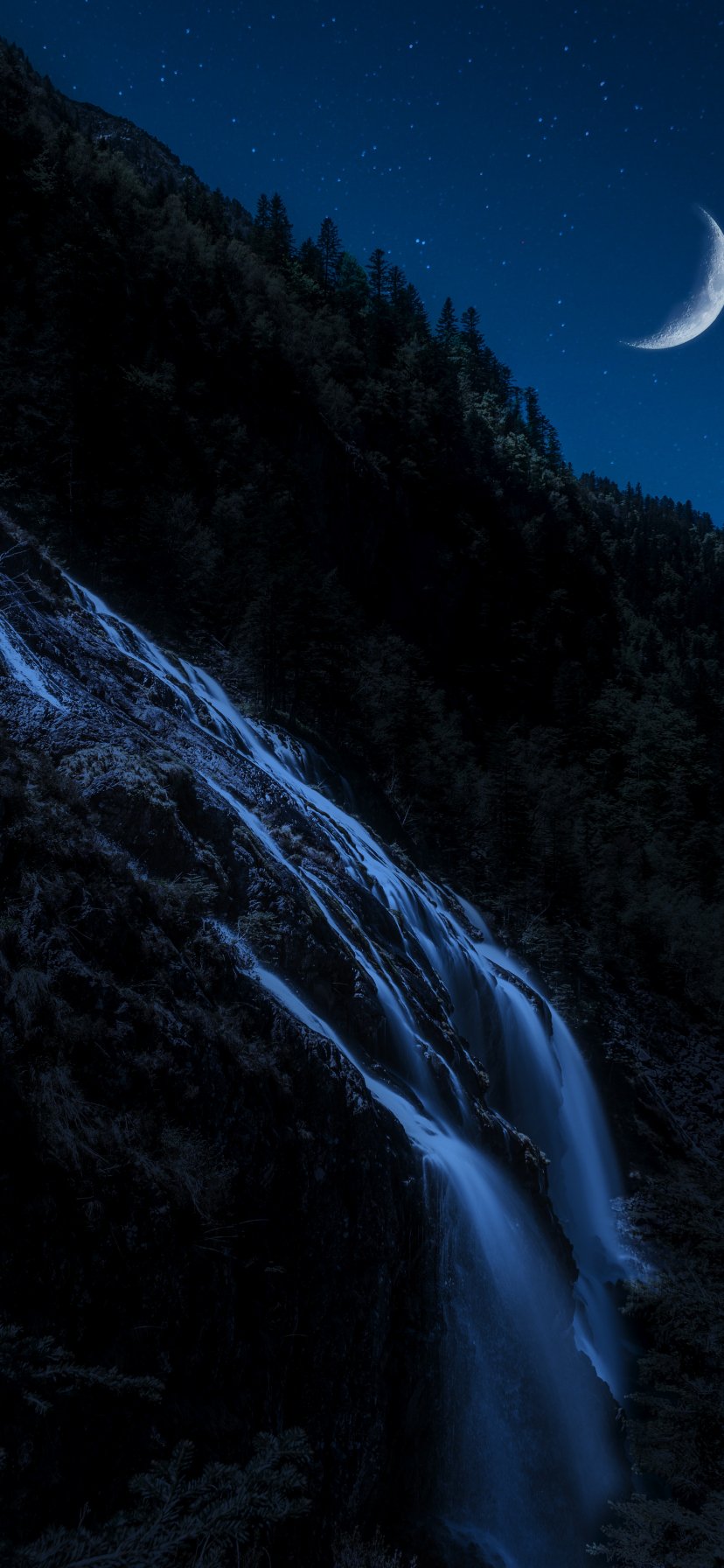 Обои: луна, водопад, ночь, месяц, горы, лес - 828x1792