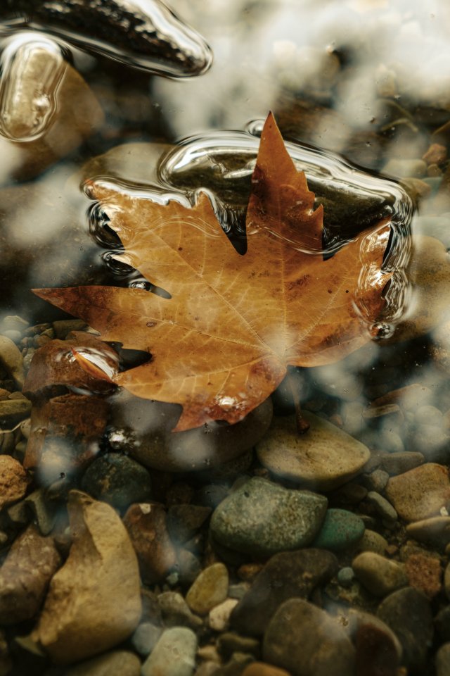 Обои: кленовый лист, лист, желтый лист, осень, лужа, вода, камни - 640x960