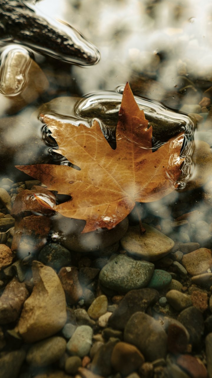 Обои: кленовый лист, лист, желтый лист, осень, лужа, вода, камни - 720x1280