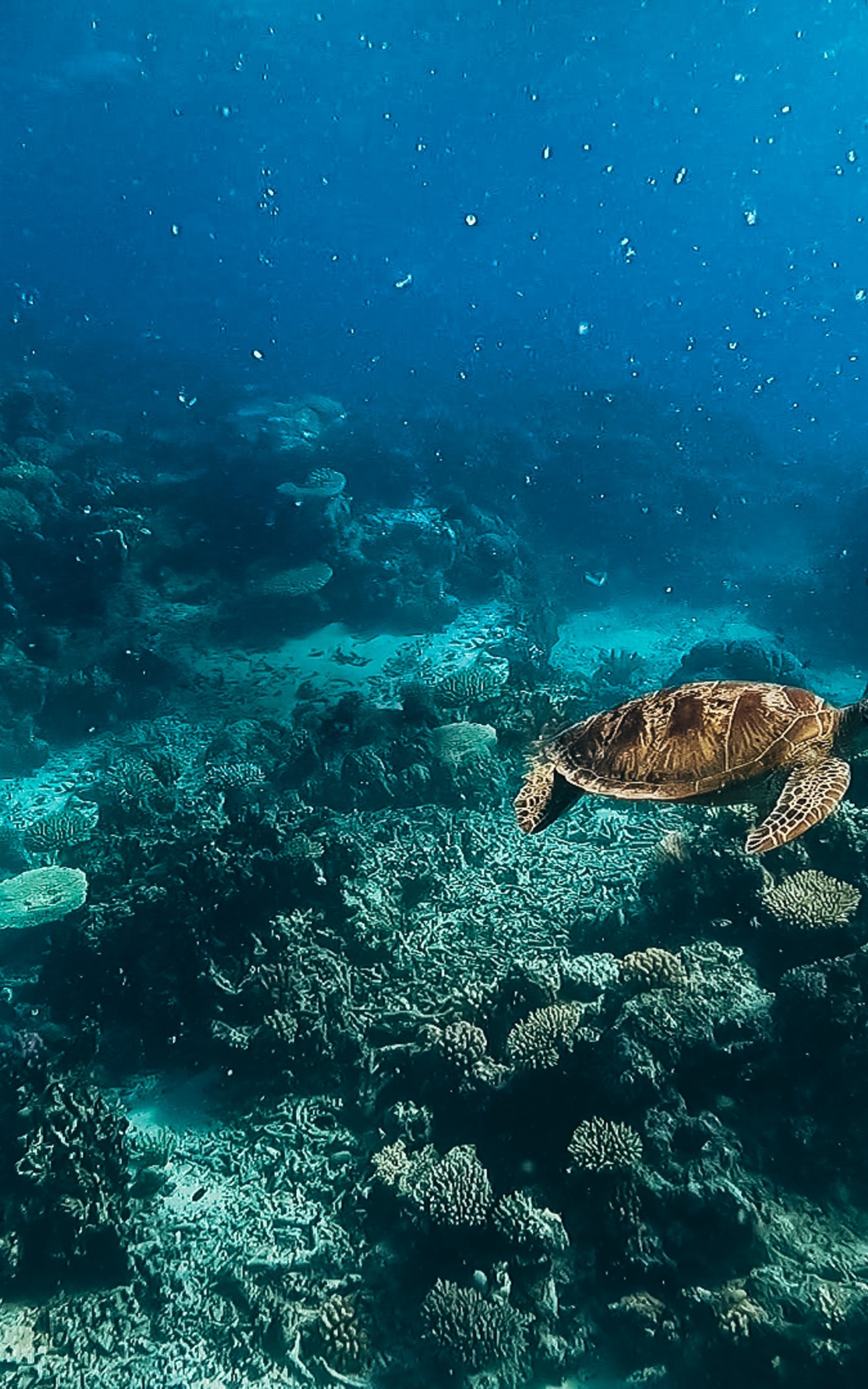 Обои: черепаха, подводный мир, аквалангист, вода, глубина, кораллы - 1600x2560