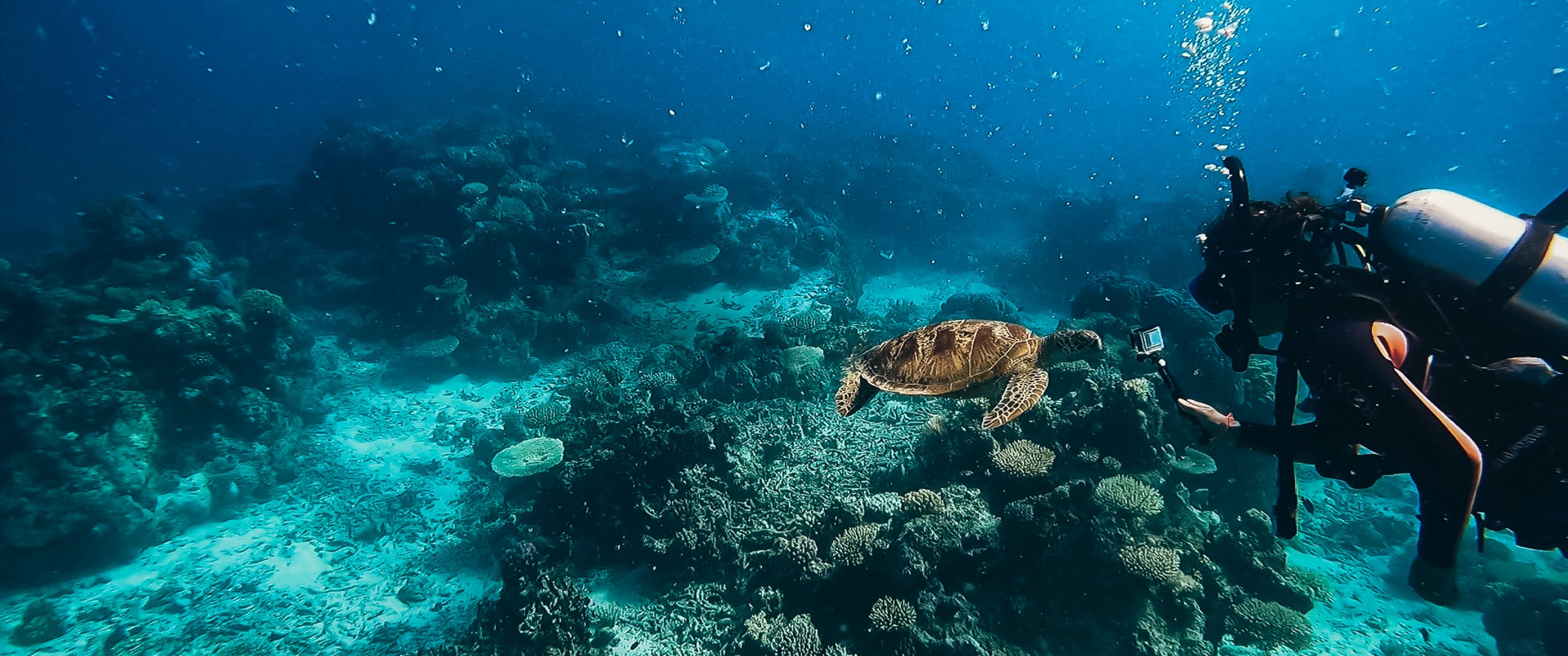 Обои: черепаха, подводный мир, аквалангист, вода, глубина, кораллы - 3440x1440