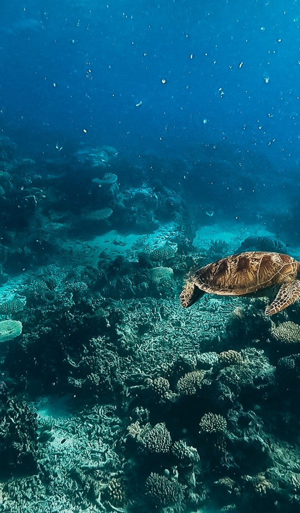 Обои: черепаха, подводный мир, аквалангист, вода, глубина, кораллы - 600x1024