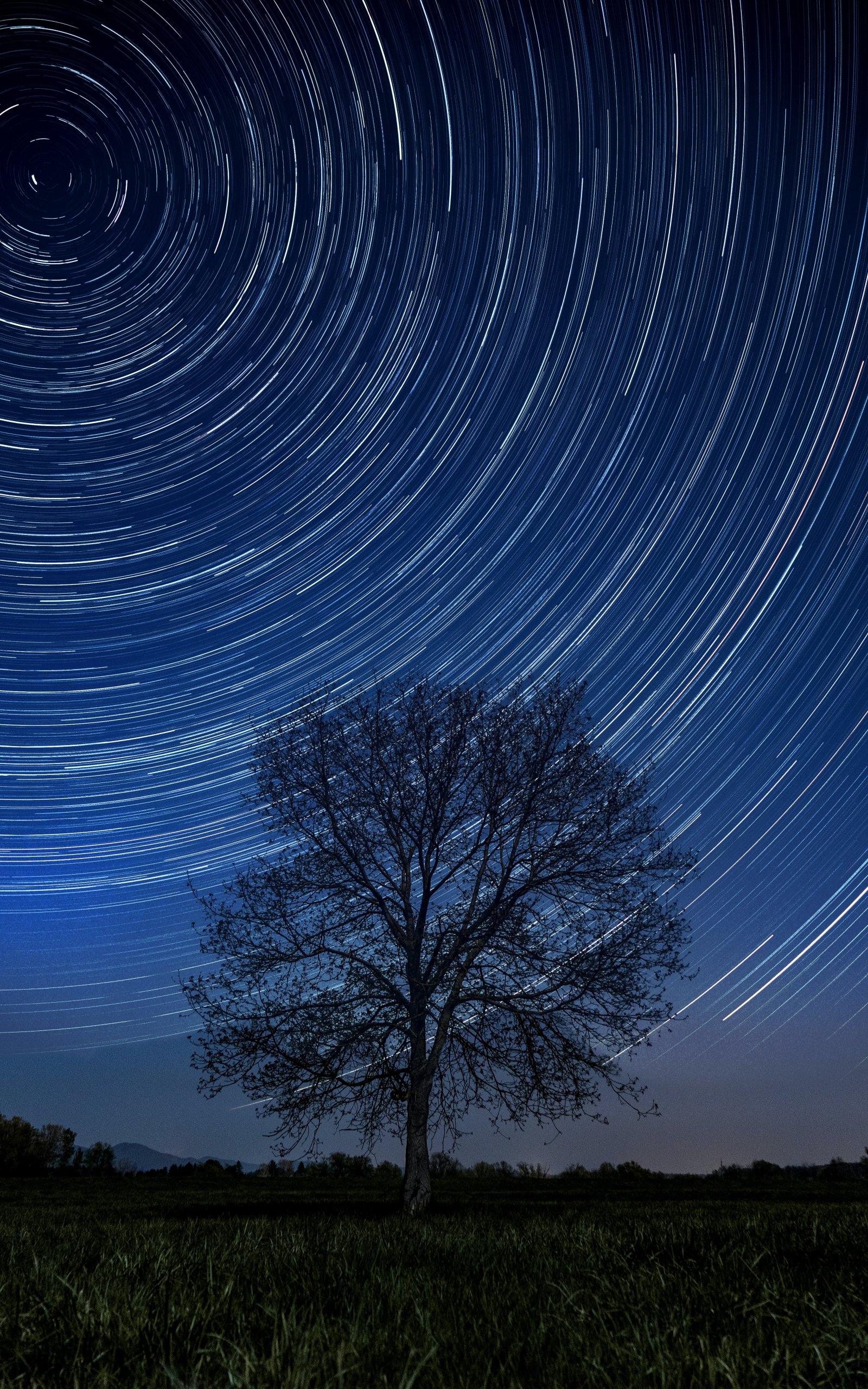 Обои: дерево, ночь, звезды, длинная выдержка, трава - 1600x2560