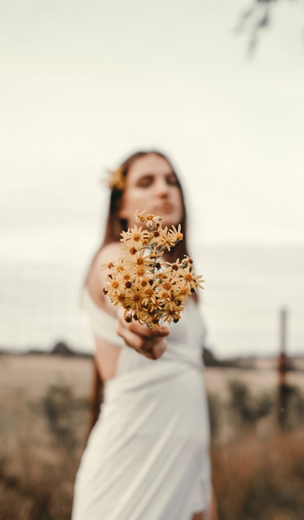 Обои: девушка, цветы, поле, ромашки, человек - 600x1024