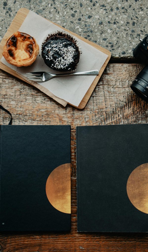 Обои: фото, кофе, фотоаппарат, ежедневник, стол, деревянный стол, кексы - 600x1024