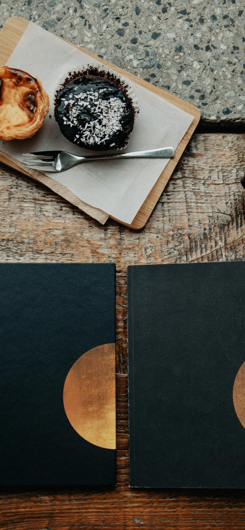 Обои: фото, кофе, фотоаппарат, ежедневник, стол, деревянный стол, кексы - 828x1792