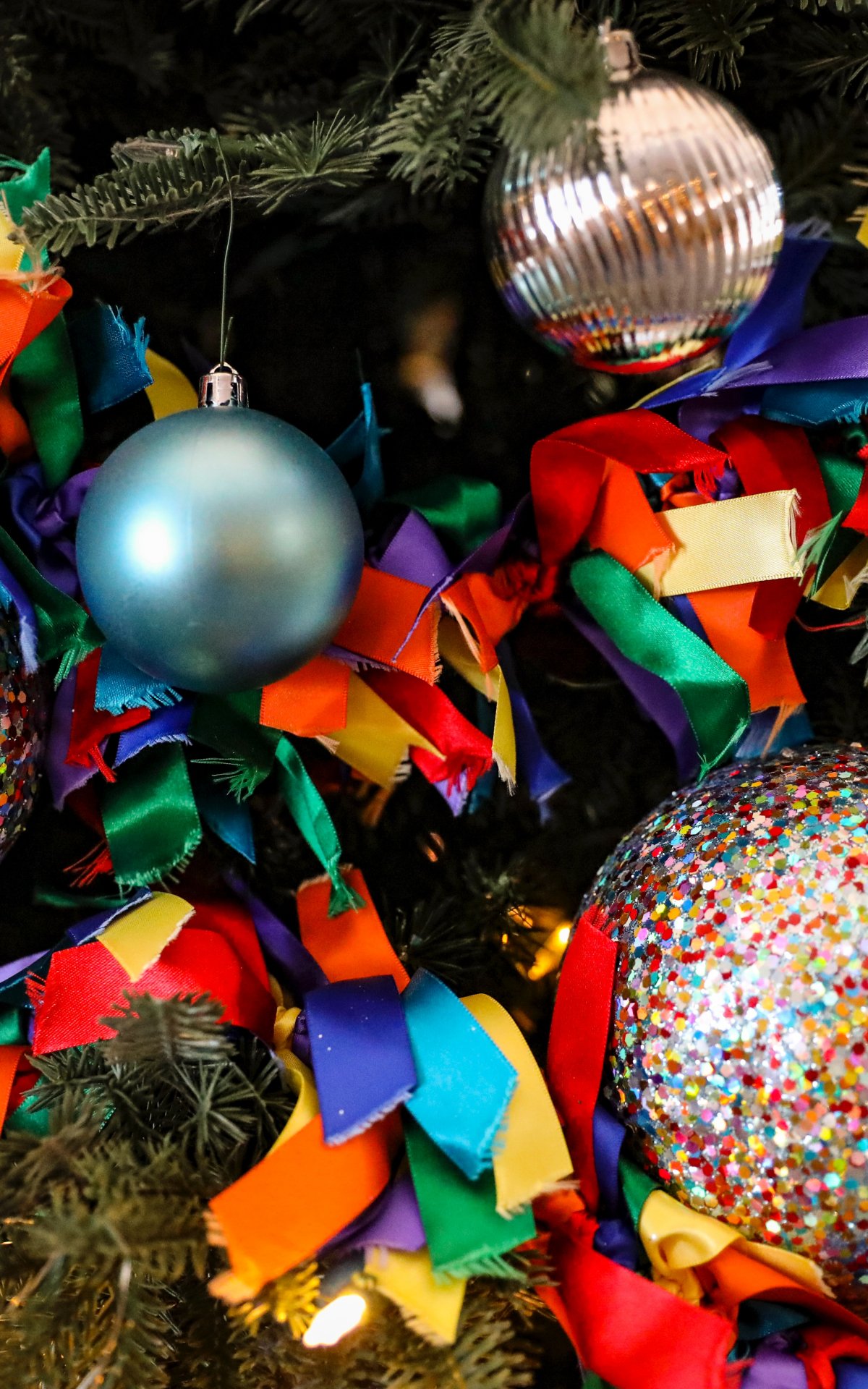 Обои: елочные игрушки, конфетти, ярко, праздник, Новый год - 1200x1920