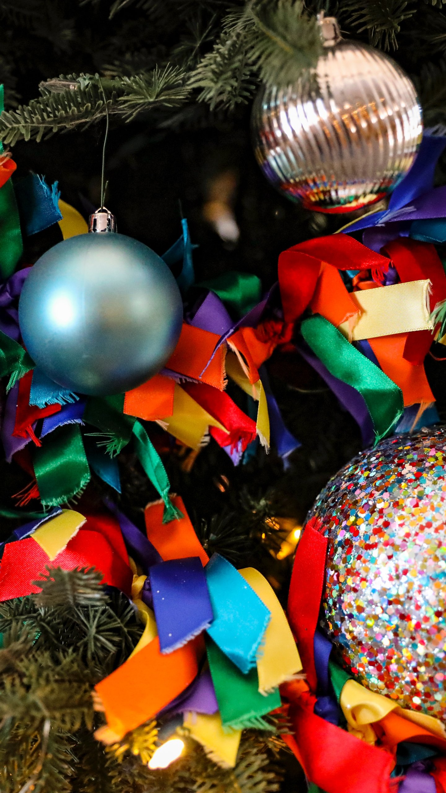 Обои: елочные игрушки, конфетти, ярко, праздник, Новый год - 1440x2560
